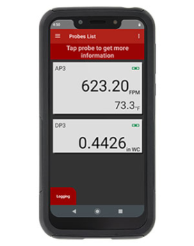 Mida y registre de forma inalámbrica la presión diferencial, la velocidad del aire, el flujo de aire volumétrico, la temperatura y la humedad.