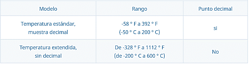 Rangos de temperatura-58 ° F a 392 ° F (-50 ° C a 200 ° C) o -328 ° F a 1112 ° F (-200 ° C a 600 ° C)
