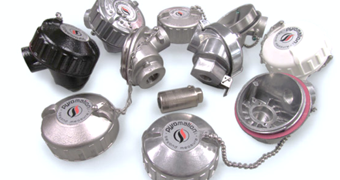 Como fabricante de línea completa, Pyromation produce sus propios cabezales de conexión patentados para sus conjuntos de sensores de temperatura y otras aplicaciones. La línea de productos incluye cabezales de conexión de aluminio, plástico, acero inoxidable y hierro fundido de uso general (GP), con clasificaciones NEMA 4X para uso en interiores o exteriores. Los cabezales de conexión RTD rediseñados a prueba de explosiones (XP), de aluminio y acero inoxidable y RTD de Pyromation están aprobados como componentes individuales o como parte de conjuntos de sensores de temperatura utilizados en ubicaciones peligrosas. La mayor parte de la línea consta de cabezales de conexión con tapa de tornillo; sin embargo, la compañía también tiene un cabezal de aluminio abatible para facilitar el acceso y un cabezal de conexión de estilo miniatura. Nuestros cabezales de conexión de termopar y RTD están diseñados para acomodar la mayoría de los bloques de terminales y transmisores, incluidos los tipos DIN de forma B.