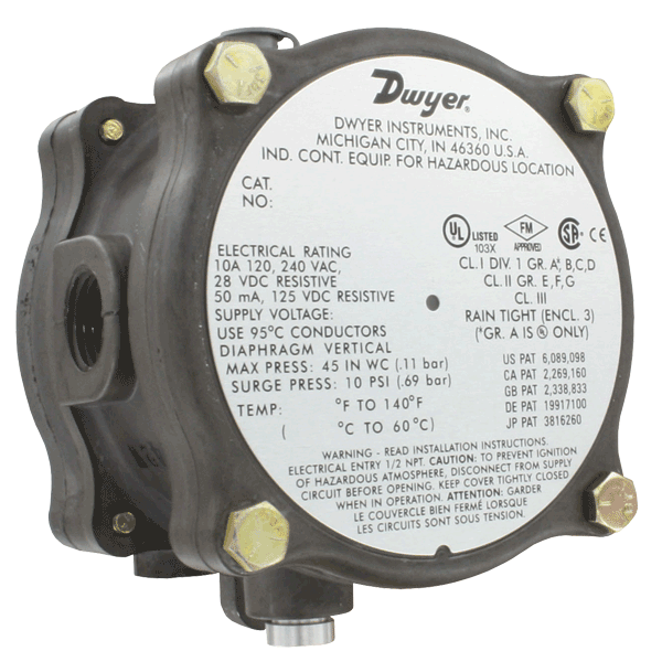 Compacto, de bajo costo, a prueba de explosiones y resistente a la intemperie: El interruptor de presión diferencial a prueba de explosiones SERIE 1950 combina las mejores características del popular interruptor de presión Dwyer® Serie 1900.