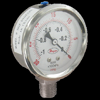 1.5% de exactitud de escala total, con piezas húmedas de acero inoxidable 316, con sistema de doble escala PSI/Bar x100 kPa