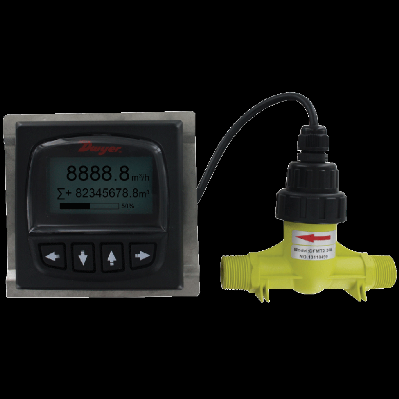 El transmisor de flujo digital remoto de rueda de paletas SERIE DFMT2 es un transmisor de flujo digital de dos piezas que provee monitoreo de flujo instantáneo y totalizador. El diseño de dos piezas permite que el usuario separe el panel de control de la aplicación, lo cual es ideal para uso industrial en sistemas purificadores de agua por osmosis inversa o cualquier otra aplicación con limitaciones de espacio. La gran pantalla LCD retroiluminada simplifica la navegación por la estructura de menús. La serie DFMT2 utiliza tecnología comprobada de rueda de paletas de gran exactitud, ofrece una salida de 4 a 20 mA o de pulsos a elección del usuario y tiene un sensor PVDF resistente a la corrosión que le brinda una larga vida útil. Los usuarios pueden restablecer el totalizador en cualquier momento y establecer una contraseña de seguridad para proteger la configuración contra cambios no autorizados.