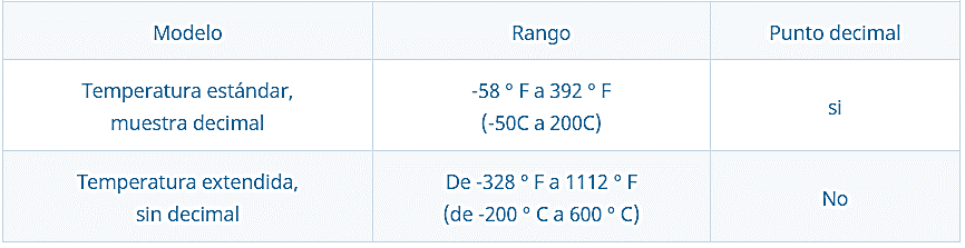 Rangos de temperatura: -58 ° F a 392 ° F (-50 ° C a 200 ° C) o -328 ° F a 1112 ° F (-200 ° C a 600 ° C)