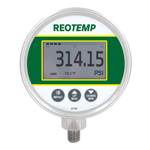 El medidor de prueba digital SERIE DT40 de REOTEMP está diseñado para probar y validar equipos e instrumentos. La conexión húmeda de acero inoxidable y el sensor con amortiguador de pulsaciones incorporado son ideales para medir la presión o el vacío en aplicaciones de gas o líquido compatibles con SS. La pantalla es personalizable, lo que permite al usuario cambiar la unidad de medida, la frecuencia de actualización, el número de decimales y la memoria de valor mínimo / máximo.